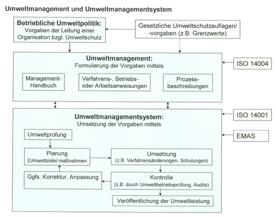 Der Teil des Managementsystems, dem die Umsetzung der betrieblichen Umweltpolitik obliegt, welche heute großteils nationalen, europäischen oder internationalen Gesetzen und Richtlinien zu folgen hat. Basis sind anleitende Normen wie etwa die Umweltmanagementnorm DIN EN ISO 14001. Diese enthalten Anforderungen, wie die schriftliche Festlegung einer betrieblichen Umweltpolitik (darin muss die Einhaltung von Anforderungen des Umweltrechts enthalten sein) und die Angabe von Verantwortlichen für umweltrelevante Aufgaben. Viele Organisationen lassen ihr UMS von externen Gutachtern zertifizieren, um in der Öffentlichkeit und bei Kunden ihre ökologische Glaubwürdigkeit zu erhöhen.